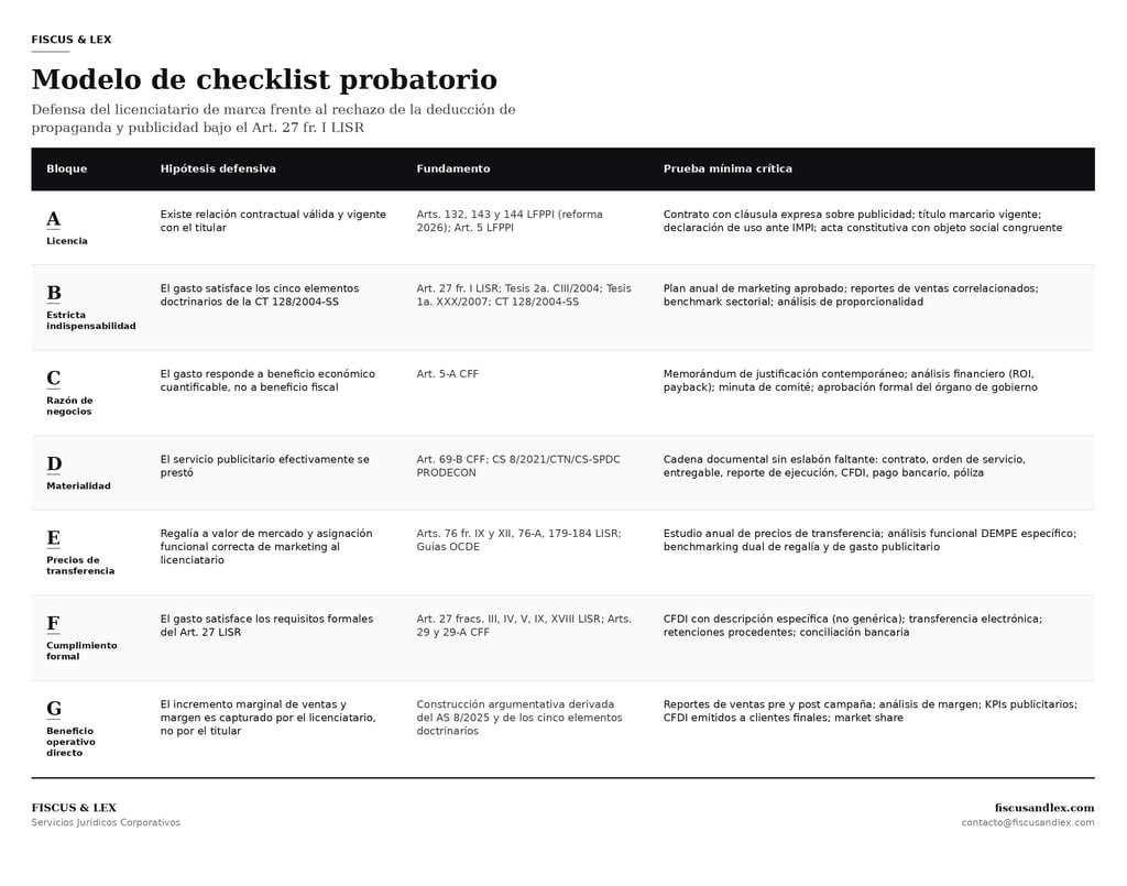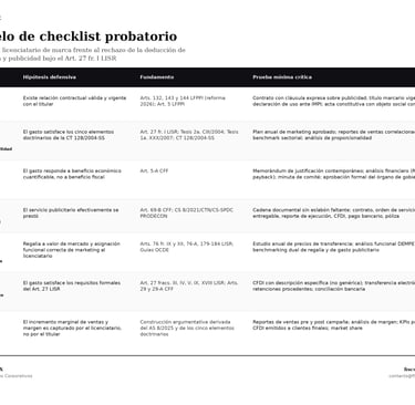 La defensa del licenciatario debe construirse no sólo sobre el Art. 27 fr. I LISR. Debe acreditar positivamente la razón de negocios bajo Art. 5-A CFF con documentación contemporánea: memorándum interno de justificación de la decisión generado antes o al momento de aprobar el gasto; análisis financiero con proyección de incremento en ventas, retorno esperado y período de recuperación; minuta de comité directivo o de marketing con asistentes, deliberaciones y firmas; aprobación formal del gasto por órgano de gobierno; reporte de seguimiento posterior con KPIs y comparación contra proyecciones.