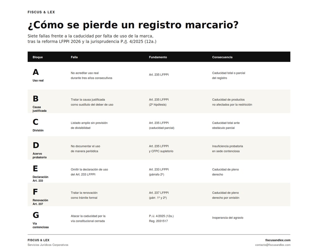 Para titulares que ya enfrentan un procedimiento de caducidad ante el IMPI, la defensa estratificada en el orden técnico (uso real → causa justificada → divisibilidad subsidiaria) es la única vía operativa tras la P./J. 4/2025. Los plazos del artículo 235 LFPPI son improrrogables; la activación tardía del expediente probatorio reduce drásticamente la viabilidad de la defensa.