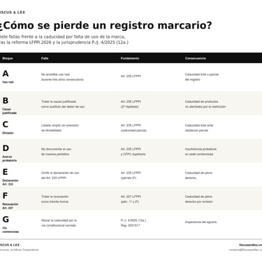 Fiscus & Lex acompaña a titulares marcarios en la auditoría del portafolio, el diseño e implementación del programa de cumplimiento marcario, y la defensa contenciosa ante el IMPI, el TFJA y los Tribunales Colegiados de Circuito. Para evaluación inicial: contacto@fiscusandlex.com.